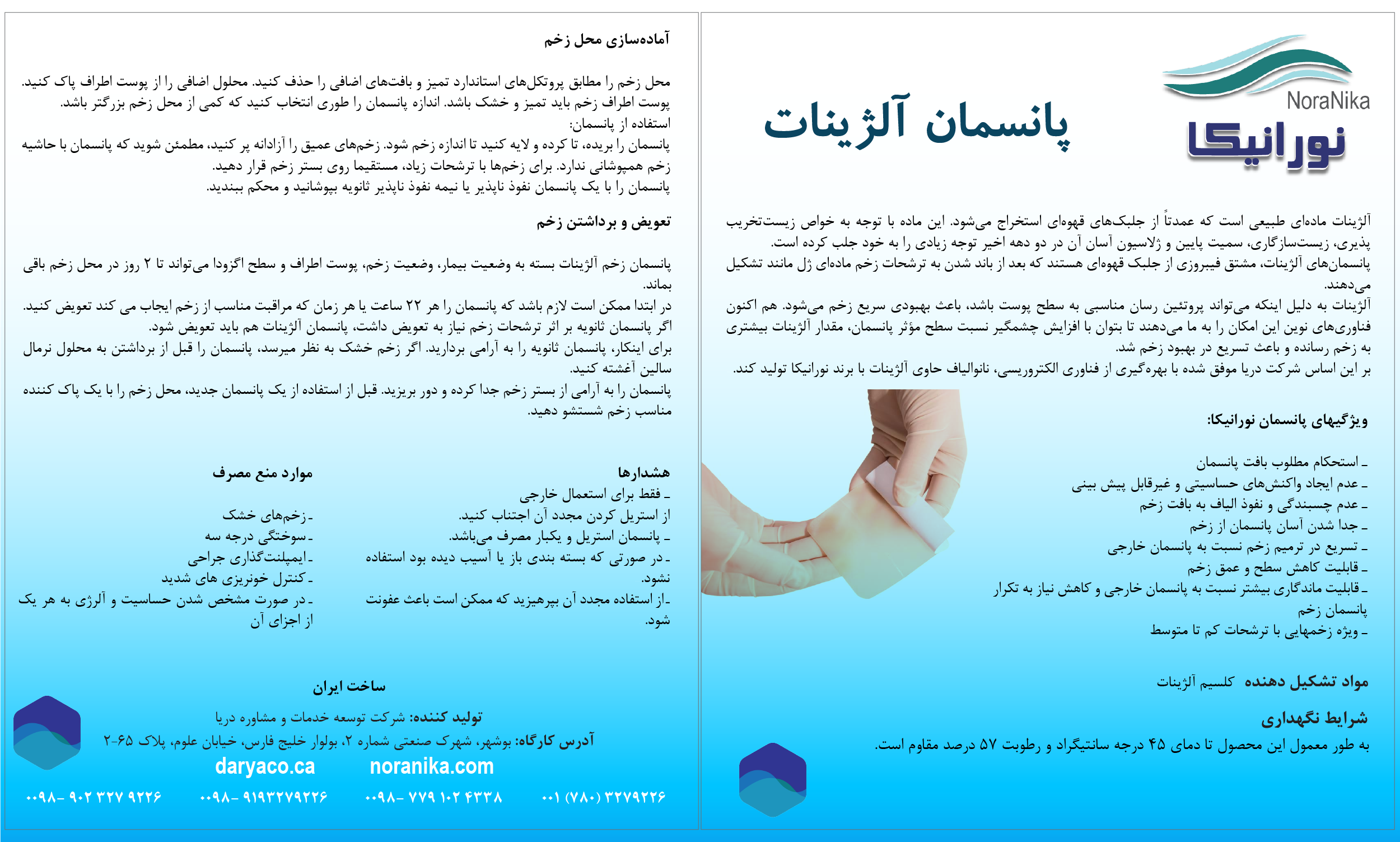 پانسمان زخم نورانیکا یک پانسمان آلژینات کلسیم از الیاف Non woven و استریل است که از یک آلژینات با استحکام ژل بالا